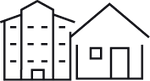 The buildings feature modern architecture with contrasting exterior finishes of dark and light mix of concrete and steel.